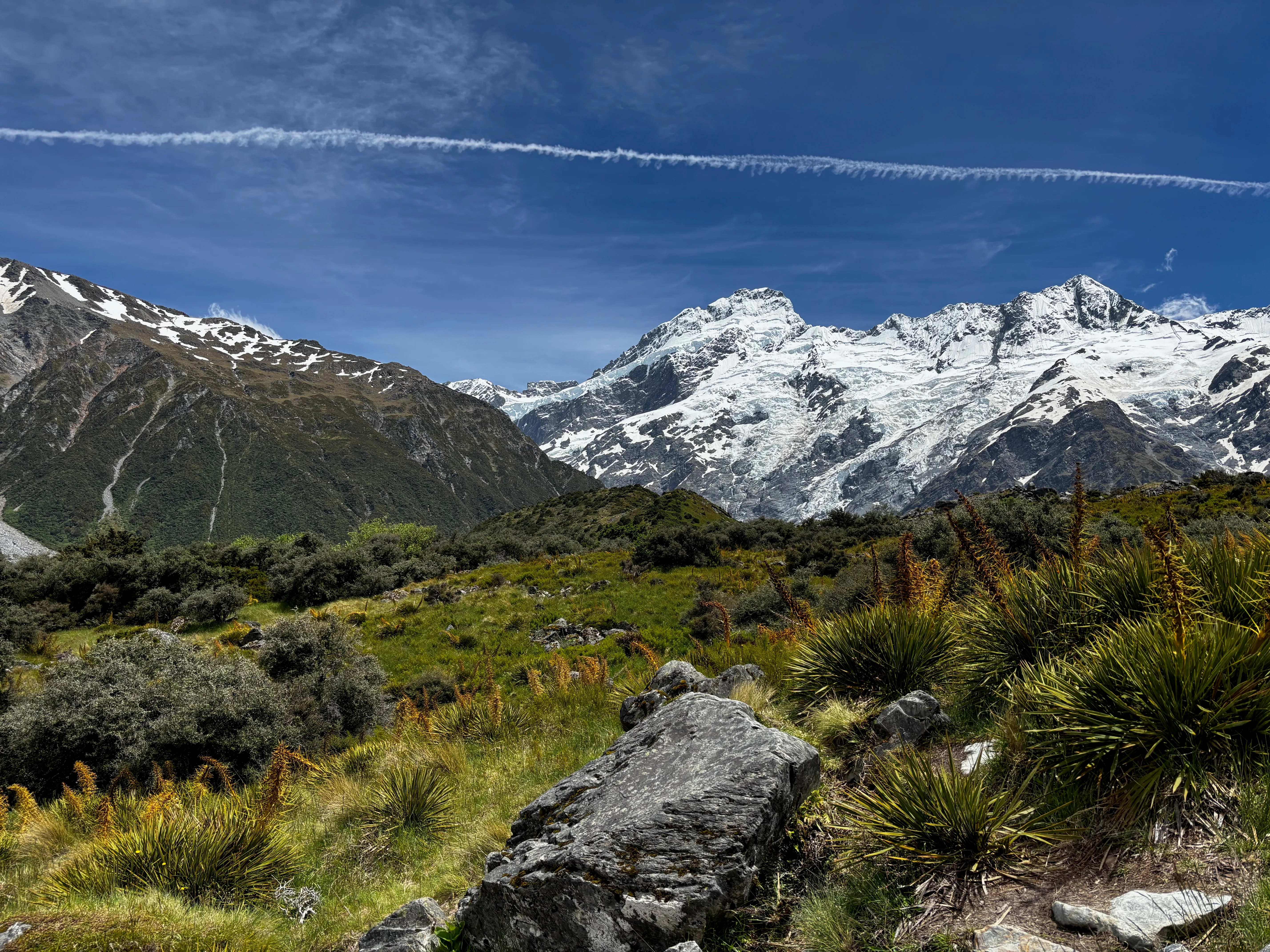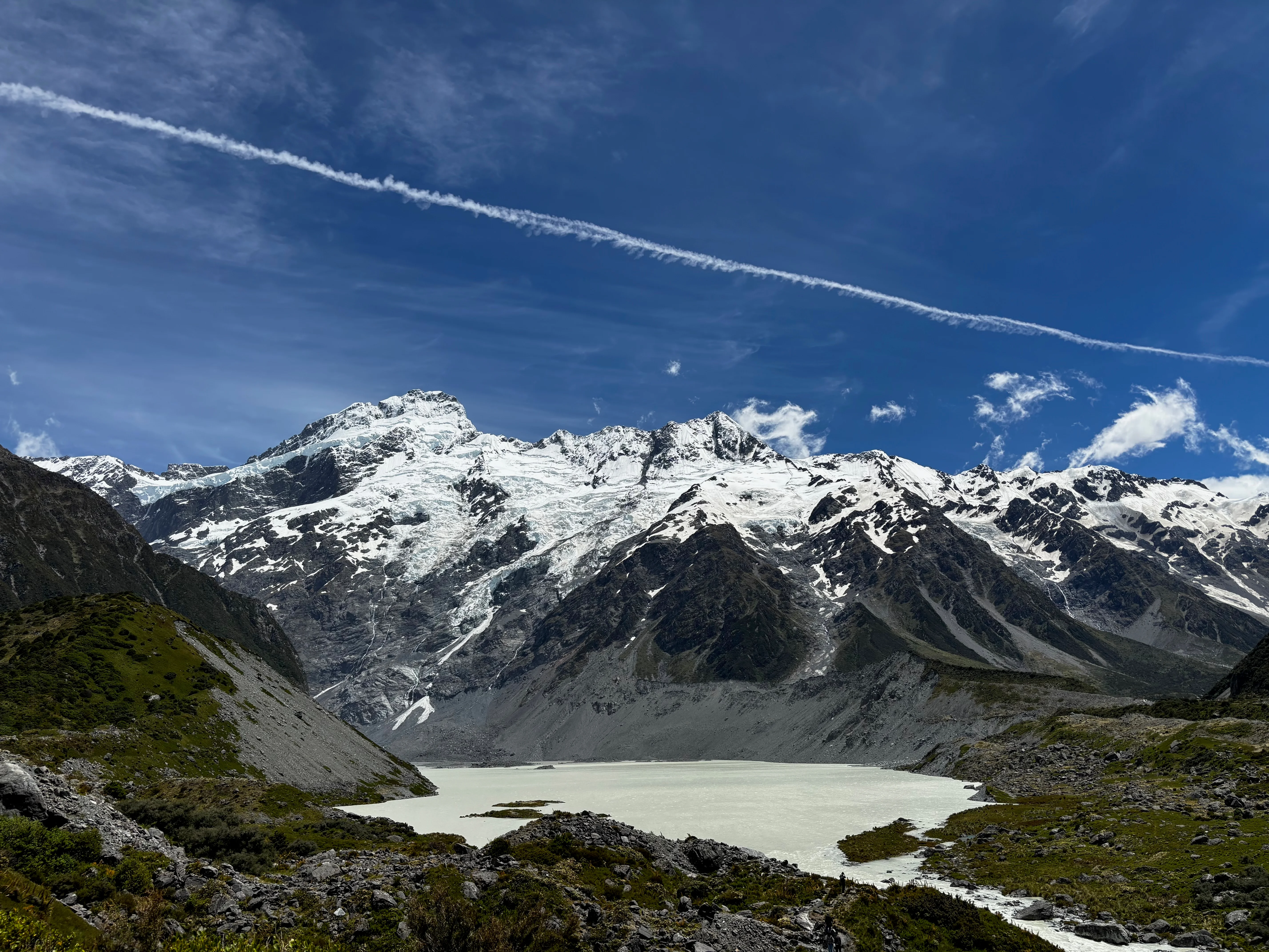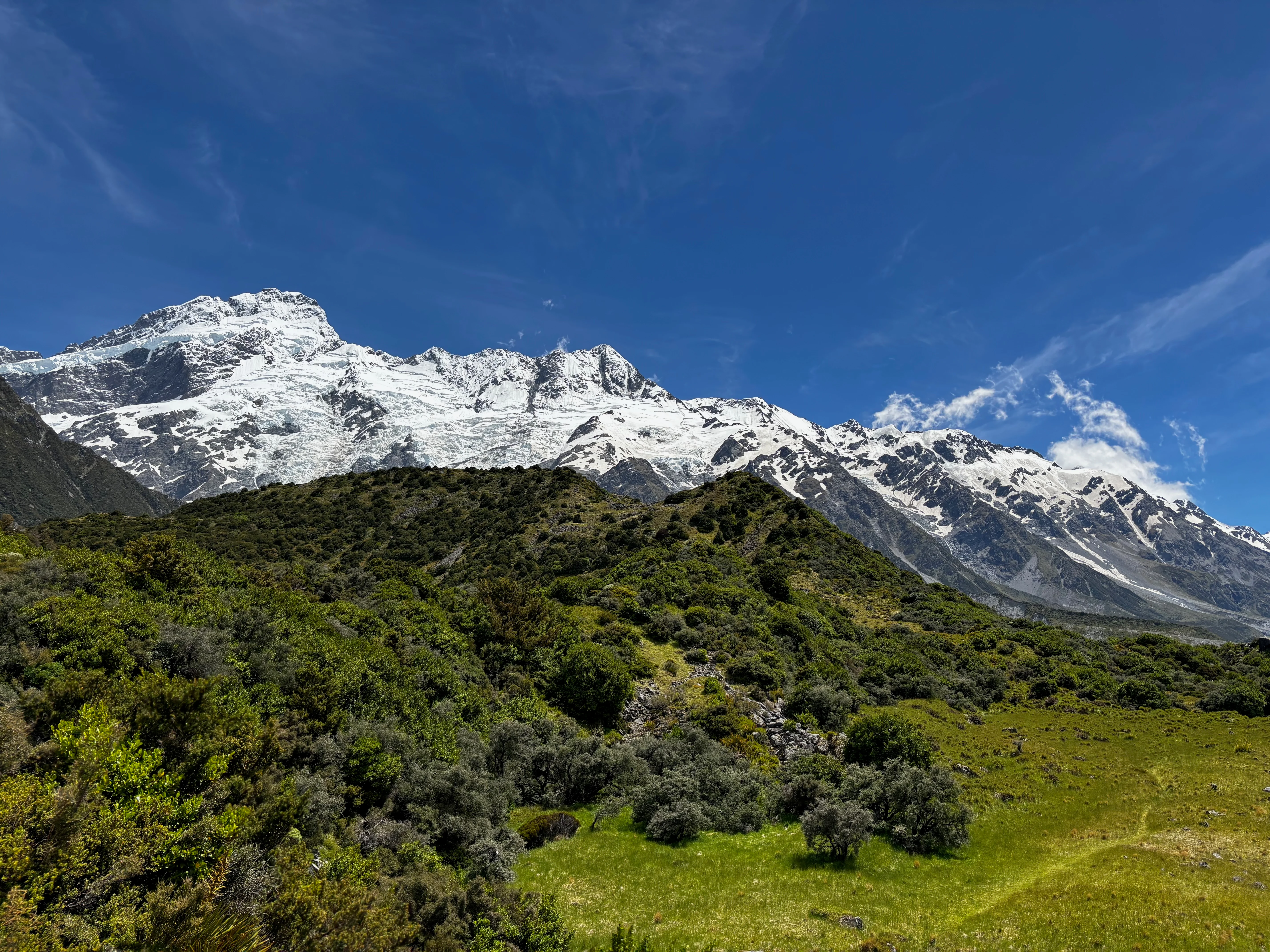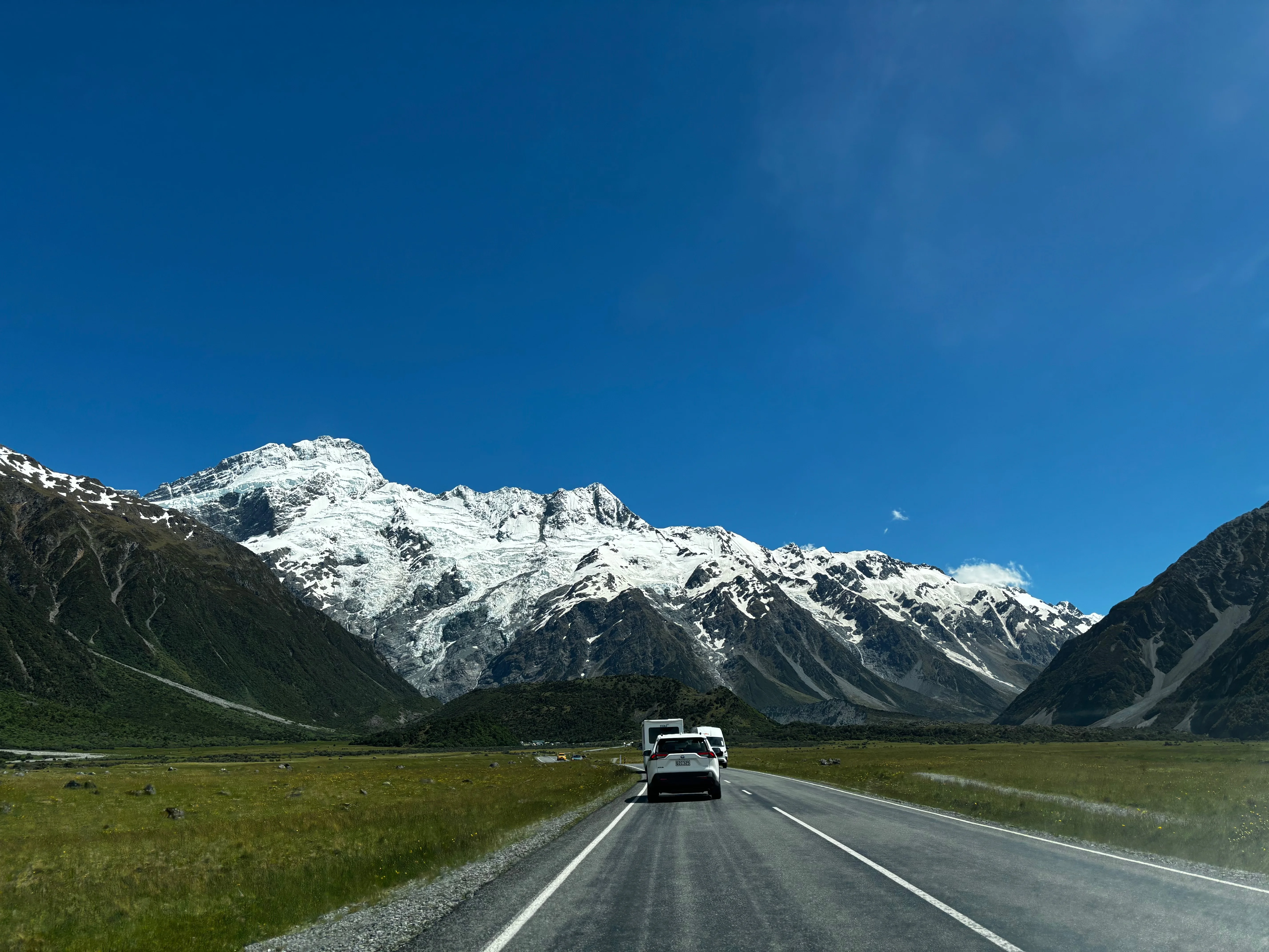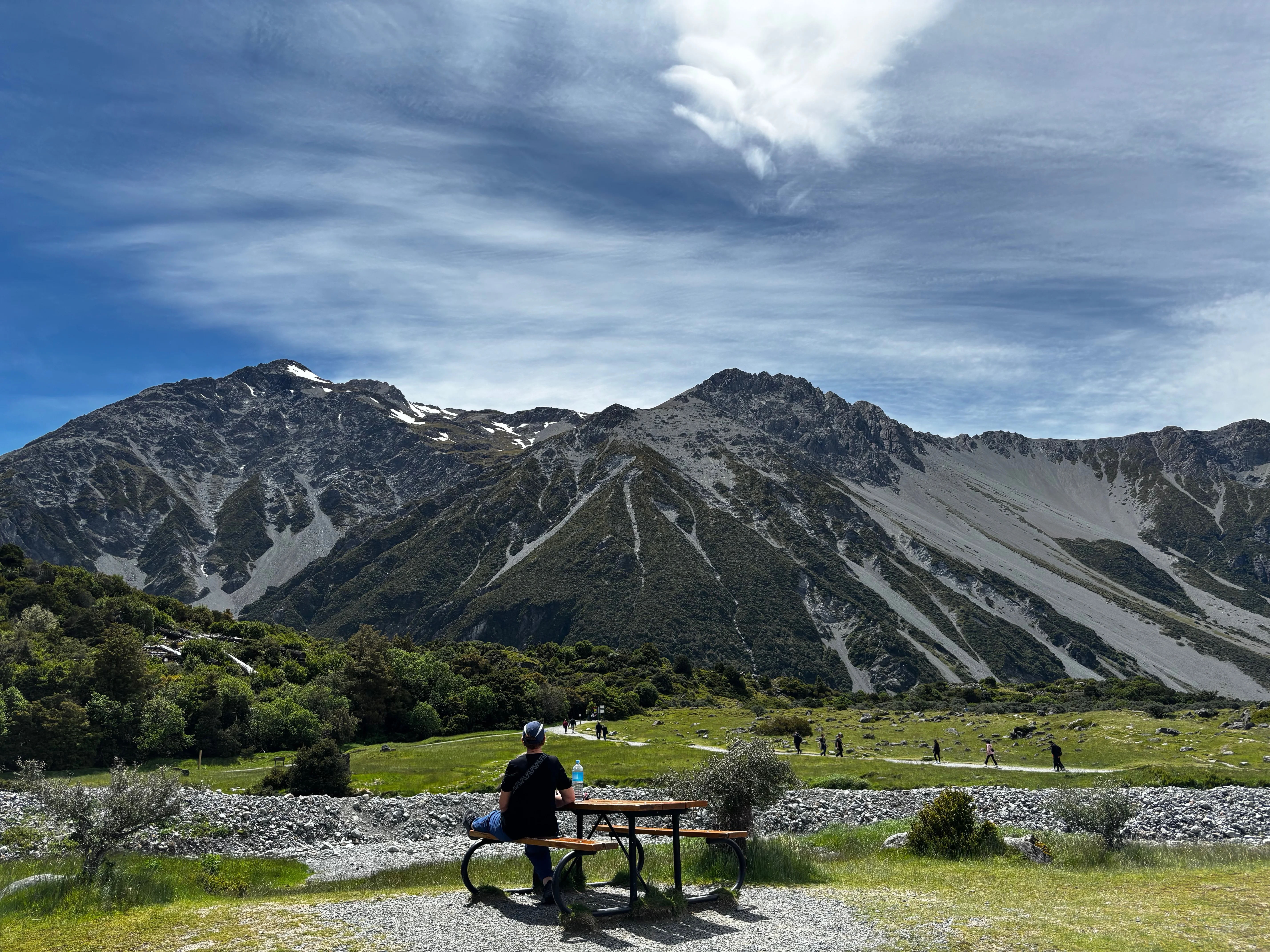 It took about 1.5 hours to drive to the Hooker Valley Track. As we drove to our destination, we couldn’t help but stop off at multiple viewpoints. The route takes three hours to complete, and even though part of the route is still closed off as of December 2025, don’t let that stop you. The alpine hills juxtapose the impressive snowy caps of the mountain perfectly. This will always be a special area to me.